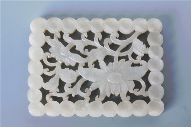 正面以镂雕加阴线饰两枝折枝菊花,一朵正面长势的稍大,另一朵侧视的稍小,边饰一圈莲珠纹。
